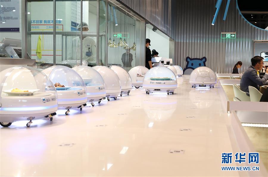近日,一家由機(jī)器人充當(dāng)送餐服務(wù)員的盒馬機(jī)器人餐廳現(xiàn)身上海國家會(huì)展中心,為顧客帶來一種用餐新選擇。