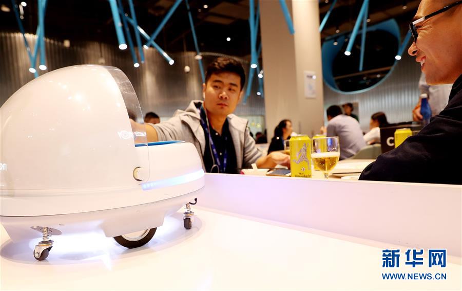10月15日,送餐機器人通過軌道將菜品送到餐桌旁。 新華社記者 方喆 攝