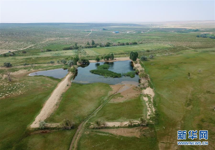 地處庫(kù)布其沙漠的恩格貝景區(qū)(6月8日無(wú)人機(jī)拍攝)。