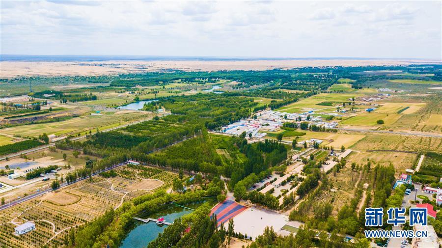 地處庫(kù)布其沙漠的恩格貝景區(qū)(6月8日無(wú)人機(jī)拍攝)。