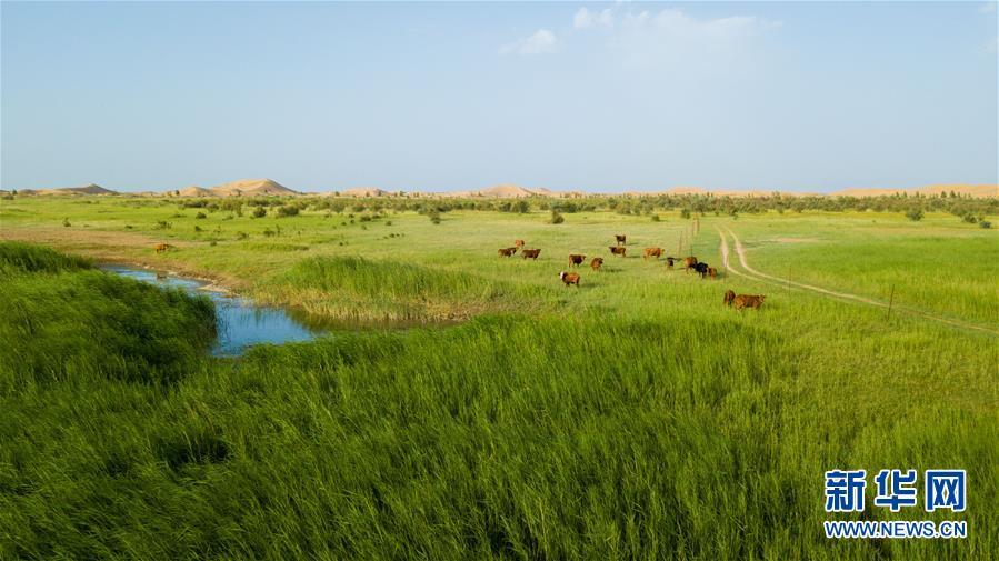 內(nèi)蒙古杭錦旗位于庫(kù)布其沙漠中的生態(tài)修復(fù)景觀(7月11日無(wú)人機(jī)拍攝)。 新華社記者彭源攝