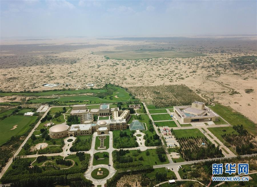 位于內(nèi)蒙古杭錦旗的七星湖沙漠酒店(8月1日無(wú)人機(jī)拍攝)。 新華社記者邢廣利攝