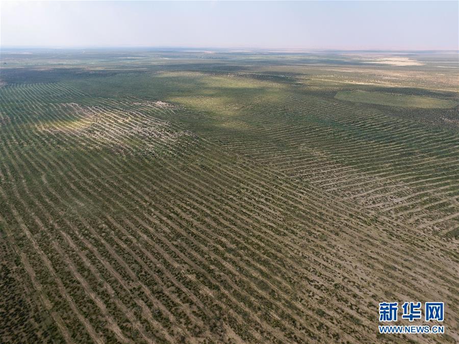 內(nèi)蒙古杭錦旗沙日召嘎查牧民白音道爾計(jì)種植的甘草等沙生植物(7月31日無人機(jī)拍攝)。 新華社記者劉磊攝