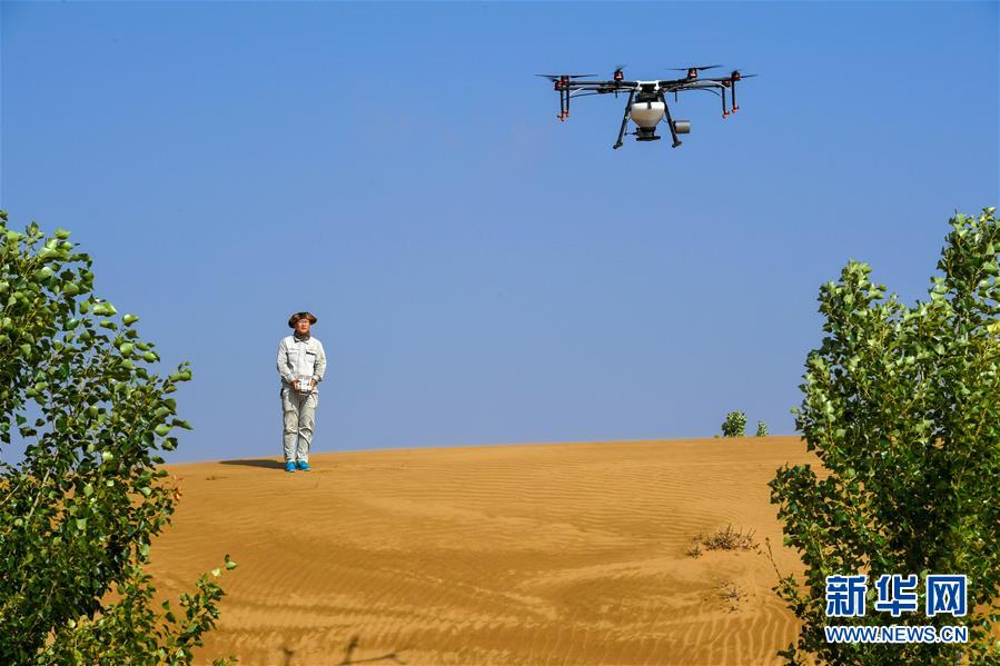 在內(nèi)蒙古鄂爾多斯市杭錦旗的庫布其沙漠中,技術(shù)人員操控?zé)o人機飛播造林(7月11日攝)。