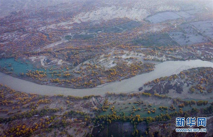 這是10月16日拍攝的從空中俯瞰新疆尉犁縣的胡楊(無(wú)人機(jī)拍攝)。 新華社記者 趙戈 攝