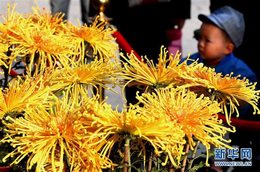 10月17日,一名小朋友在開封龍亭公園內(nèi)觀看菊花。重陽時節(jié),各色菊花競相綻放,把古都開封裝點(diǎn)得分外秀美,吸引眾多游客前來觀賞游玩。 新華社記者 李安 攝
