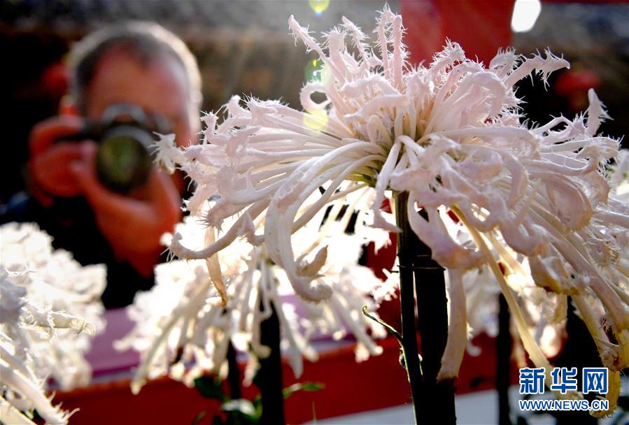 10月17日,游客在開封清明上河園內(nèi)拍攝展出的菊花。重陽(yáng)時(shí)節(jié),各色菊花競(jìng)相綻放,把古都開封裝點(diǎn)得分外秀美,吸引眾多游客前來觀賞游玩。 新華社記者 李安 攝