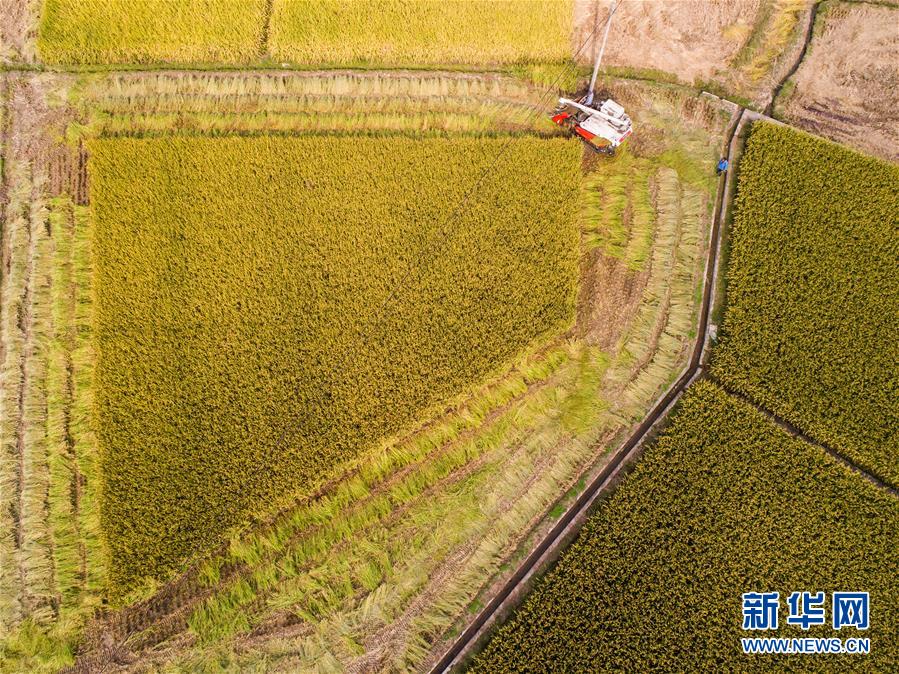 10月17日,工作人員操作收割機(jī)收割水稻(無(wú)人機(jī)拍攝)。 新華社記者 徐昱 攝