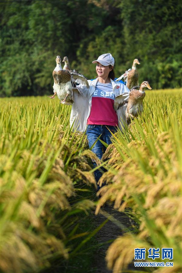 10月17日,種植基地負責人陳梅芳抓住幾只稻田放養(yǎng)的鴨子。 新華社記者 徐昱 攝