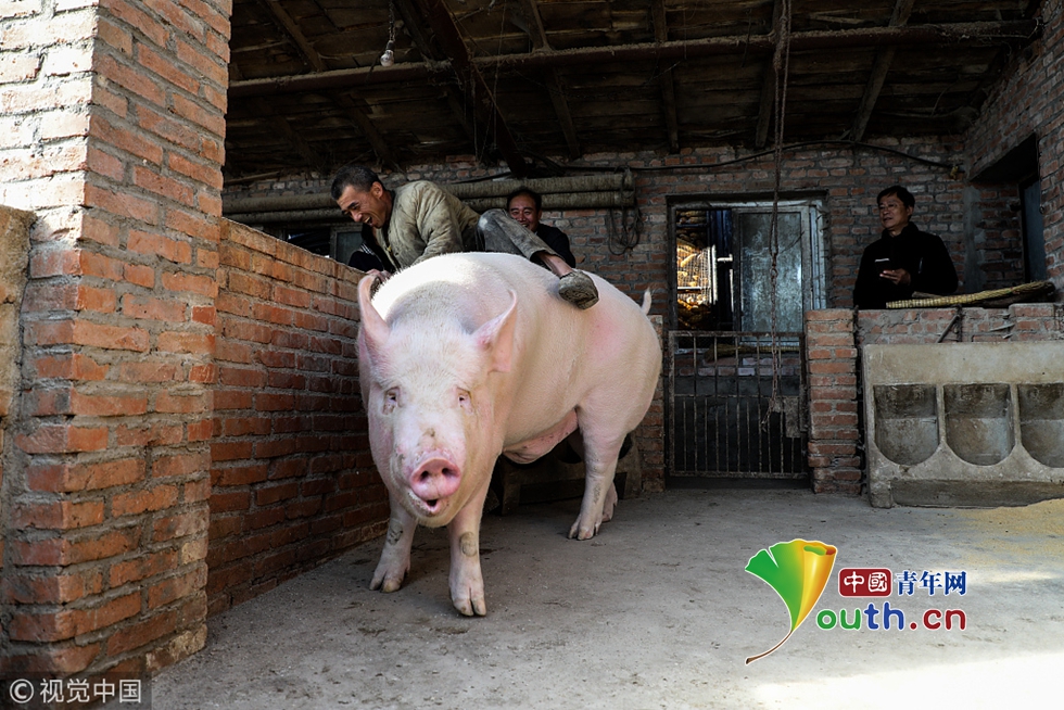 村里一位83歲的老人在圍觀時(shí)說,活了一輩子第一次見到這么大的豬,豬是好豬,但是賣不出去愁人啊。900斤大豬是個(gè)什么概念?體長(zhǎng)2米25、腰圍1米75,站立高度1米10。此時(shí)此刻,900斤大豬完全不知主人的苦,也完全不知道外面的世界發(fā)生了什么。圖為養(yǎng)豬戶張先生險(xiǎn)些從900斤大豬背上摔下來。圖片作者:棋簿紫/視覺中國(guó)