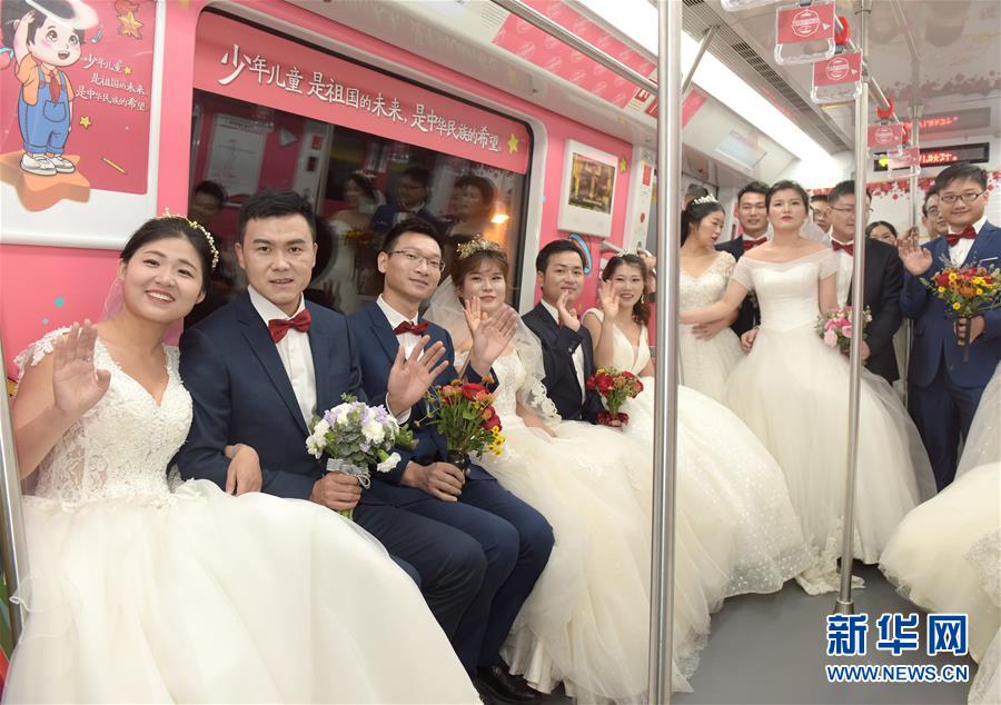 10月18日,在合肥市地鐵一號(hào)線車廂內(nèi),新人們合影留念。 當(dāng)日,中鐵四局集團(tuán)城市軌道交通工程分公司的18對(duì)新人在安徽合肥地鐵一號(hào)線的車廂里舉行了一場(chǎng)集體婚禮儀式。 新華社記者 郭晨 攝