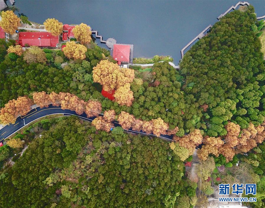 這是如琴湖旁公路的秋色風(fēng)光(10月20日無人機(jī)拍攝)?! ⌒氯A社記者 胡晨歡 攝