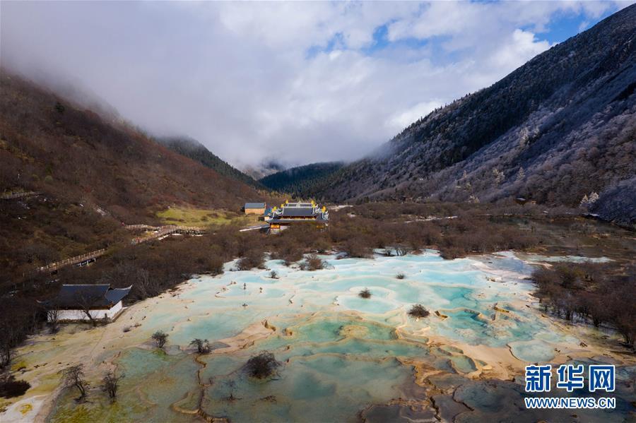 俯瞰黃龍溝五彩池一角(10月19日無人機拍攝)。深秋時節(jié),在雪山、藍天、白云和彩林映襯下,黃龍溝中的彩池色彩更加斑斕,目前黃龍景區(qū)進入觀賞最佳時節(jié)。黃龍風景名勝區(qū)位于四川省松潘縣境內(nèi),以彩池、灘流、雪山、峽谷、森林等聞名,享有“人間瑤池”“圣地仙境”之美譽。新華社記者 江宏景攝
