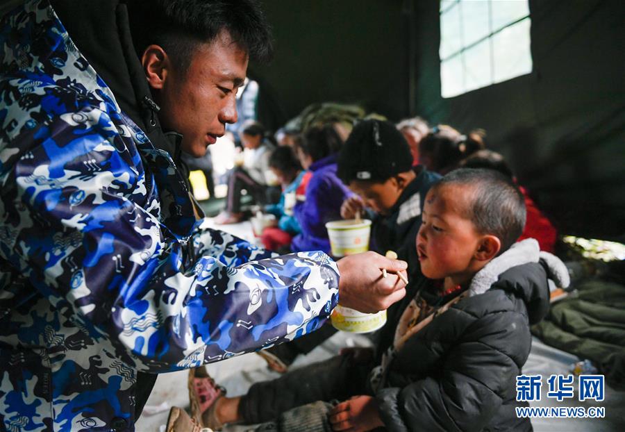 波羅鄉(xiāng)一名工作人員在臨時過渡安置點帳篷內給一名兒童喂飯(10月14日攝)。 新華社記者 劉東君 攝