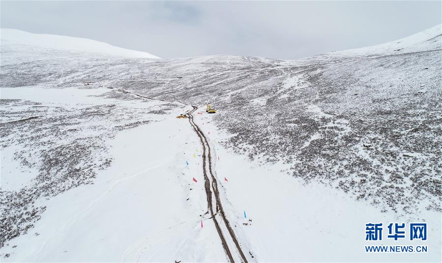 工作人員駕駛大型機械在昌都市江達縣的高山牧場上搶通道路(10月14日攝)。新華社記者 劉東君 攝