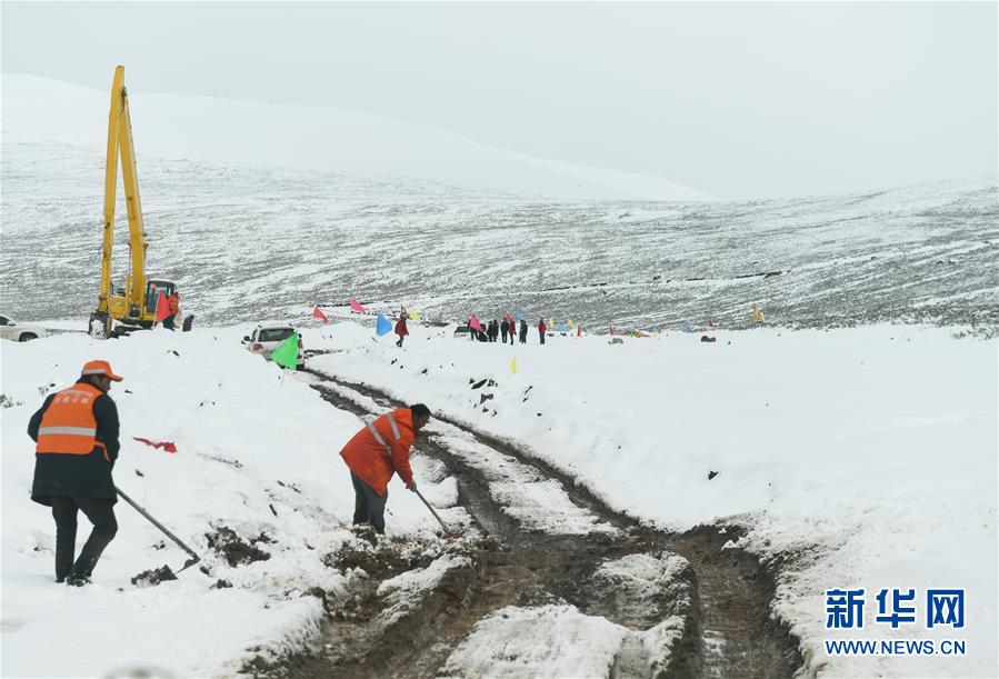 西藏道路搶通人員在西藏昌都市江達縣海拔4500米左右的高山牧場上搶通道路(10月14日攝)。新華社記者劉東君攝