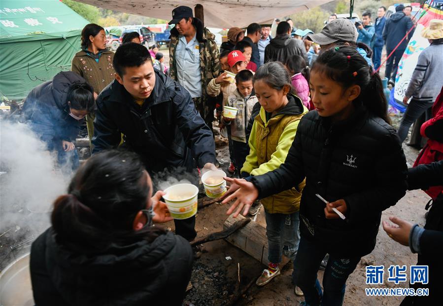 波羅鄉(xiāng)工作人員在臨時過渡安置點內為波羅鄉(xiāng)第一小學學生盛晚飯(10月14日攝)。 新華社記者 劉東君 攝