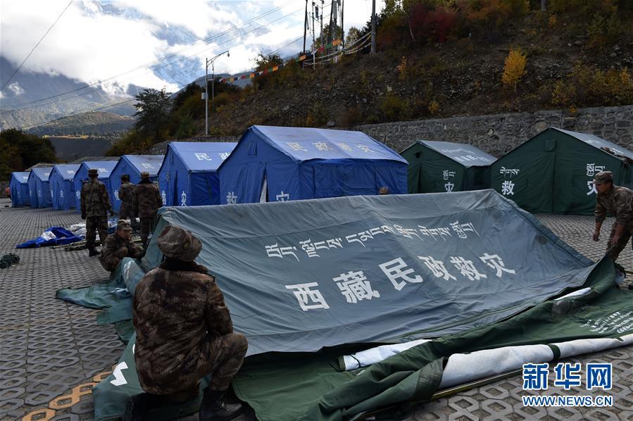10月19日,救援人員在米林縣派鎮(zhèn)尼定村搭建安置點。 記者從西藏自治區(qū)林芝加拉村雅魯藏布江堰塞湖災情應急搶險工作第二場新聞發(fā)布會上獲悉,19日13時30分,雅魯藏布江米林縣堰塞體上游水位超過堰塞體,開始自然過流,上游水位正在緩慢下降。目前,各項搶險救援工作正在有序開展。 新華社記者 覺果 攝