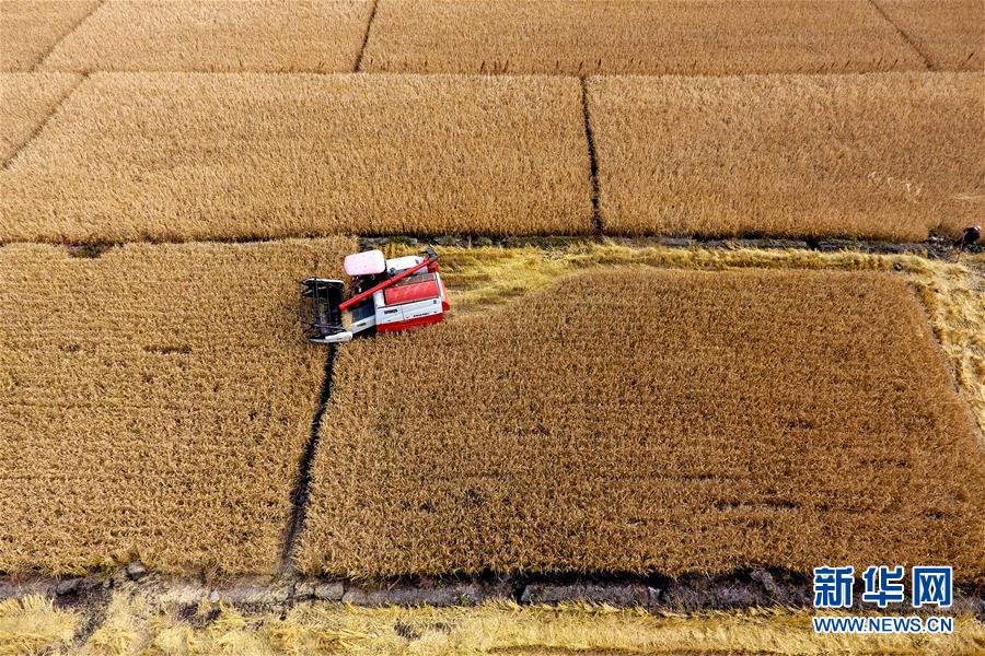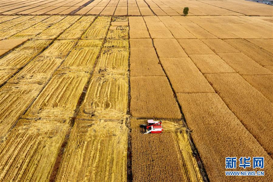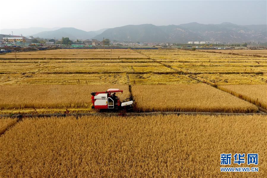 在太原市晉源區(qū)赤橋村,收割機(jī)在稻田里作業(yè)(10月17日無(wú)人機(jī)拍攝)。近日,山西省太原市晉源區(qū)2000多畝水稻迎來(lái)收割季。 金秋時(shí)節(jié),農(nóng)民們忙著收獲成熟的農(nóng)作物,喜迎豐收。 新華社記者 詹彥 攝