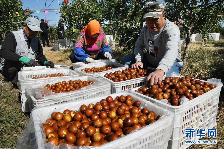 10月17日,在山東省青島市即墨區(qū)藍(lán)村鎮(zhèn)王演莊北村,種植戶(hù)在果園里收集采摘的大棗。 金秋時(shí)節(jié),農(nóng)民們忙著收獲成熟的農(nóng)作物,喜迎豐收。 新華社記者 李紫恒攝