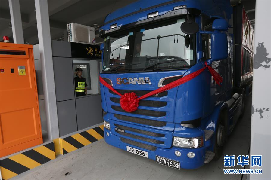 10月24日,港珠澳大橋珠海公路口岸通車(chē)首票出口貨物抵達(dá)一站式貨車(chē)出境驗(yàn)放通道。當(dāng)日9時(shí),港珠澳大橋正式通車(chē)。 新華社記者張加揚(yáng)攝