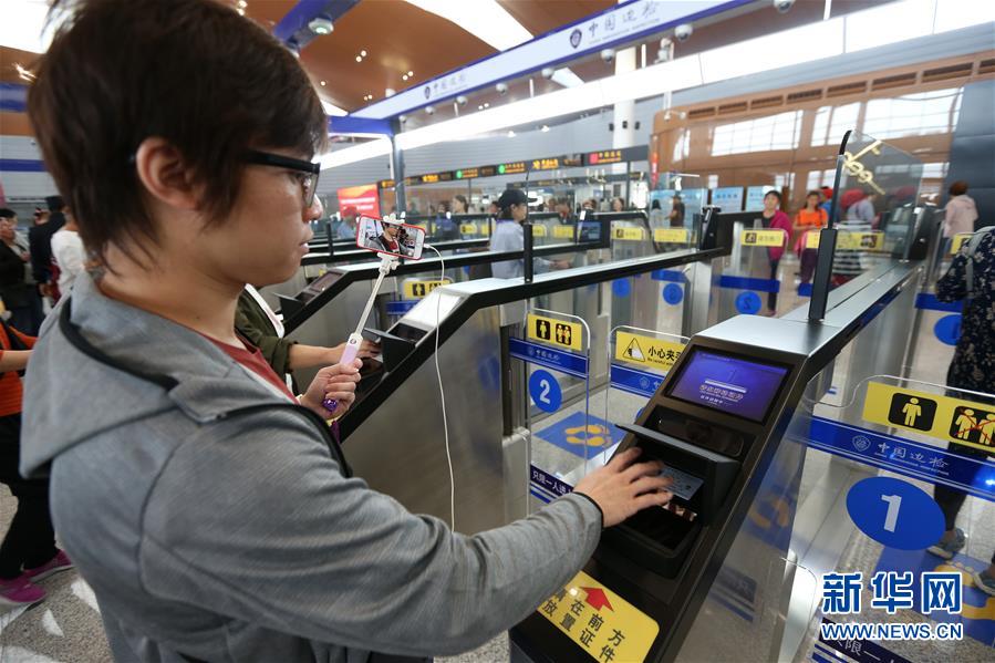 10月24日,一名男子手持自拍桿在自助通道過關(guān)。 當(dāng)日,港珠澳大橋正式通車。