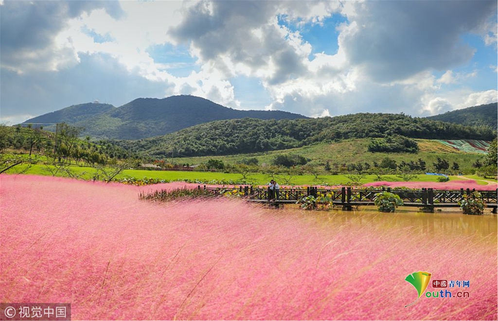 當(dāng)游客來到這里,立刻被眼前的一片浪漫的粉色所吸引。只見半人高的粉黛亂子草,縹緲如輕煙,搖曳似夢(mèng)幻,伴著微風(fēng)掀起了一陣陣的波浪。