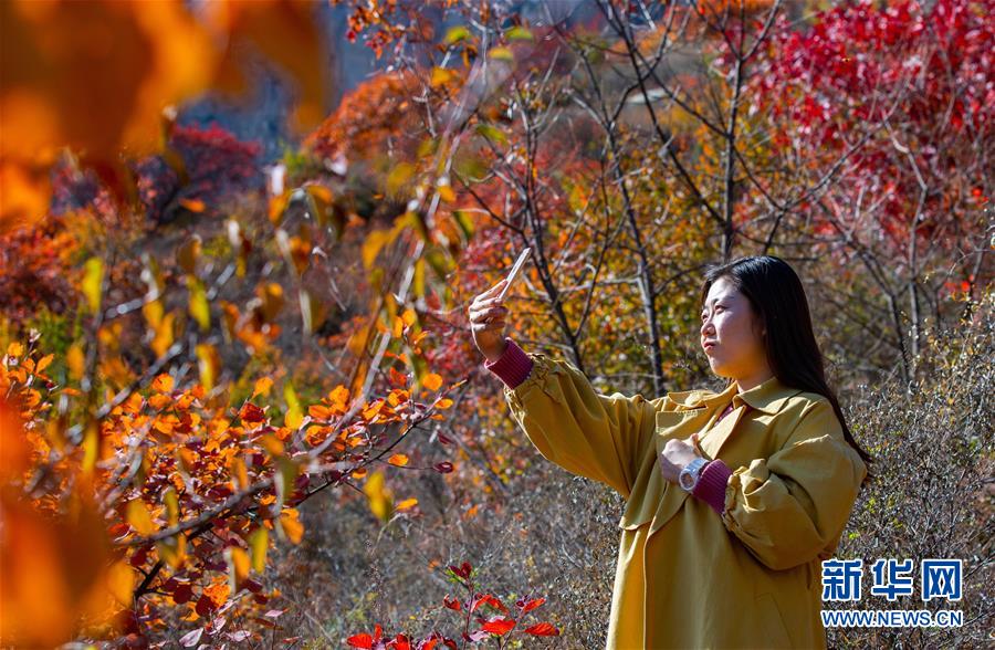 10月24日,游客在河北省武安市賀進鎮(zhèn)后臨河村拍照留念。 金秋時節(jié),位于太行山區(qū)的河北省武安市賀進鎮(zhèn)后臨河村的紅葉進入觀賞佳期。 新華社記者 王曉 攝