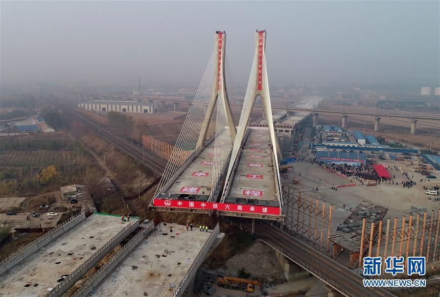 10月25日,唐山市二環(huán)路項目上跨津山鐵路斜拉橋在轉(zhuǎn)體中(無人機拍攝)。 當(dāng)日,河北省唐山市二環(huán)路項目上跨津山鐵路斜拉橋轉(zhuǎn)體成功。據(jù)介紹,該橋總長927.5米,主橋由斜拉轉(zhuǎn)體橋和轉(zhuǎn)體T構(gòu)橋組成,轉(zhuǎn)體總重5.1萬噸,其中斜拉轉(zhuǎn)體橋重3.3萬噸,主塔高達80.5米,為曲線變截面“雙人字”形空心塔,自上而下共有128根斜拉索。 新華社記者楊世堯攝