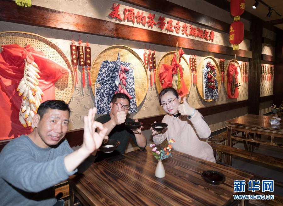 游客在浙江省建德市大同鎮(zhèn)管村橋村文化禮堂品嘗該村特產(chǎn)土酒(2018年3月13日)。2017年起,建德市對農(nóng)村文化禮堂建設進行“一村一品”提升改造,打造惠民、育德、展示等為一體的文化禮堂,嘗試“鄉(xiāng)村文創(chuàng)客廳”建設,促進鄉(xiāng)村振興。新華社記者 翁忻旸 攝