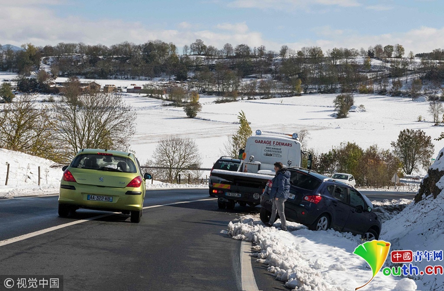 當(dāng)?shù)貢r(shí)間2018年10月30日,法國菲克斯圣熱內(nèi),當(dāng)?shù)赝唤荡笱?,?dǎo)致950人被困在大雪覆蓋的公路上,不得不睡在緊急救援中心。法國國家氣象局已經(jīng)將當(dāng)?shù)刂糜诔壬踩渲隆?/p>