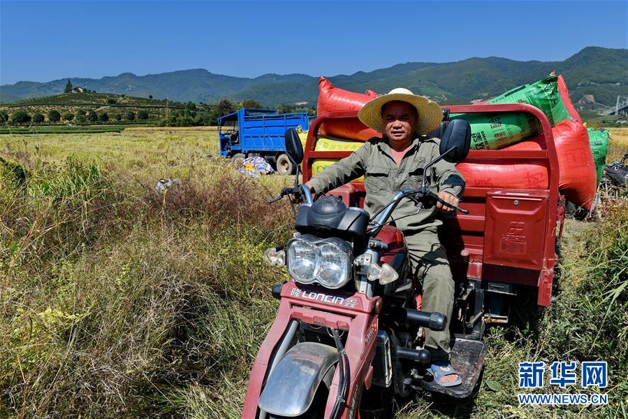 10月31日,武夷山市興田鎮(zhèn)南岸村農(nóng)民在運(yùn)輸收獲的稻谷。 新華社記者 張國(guó)俊 攝