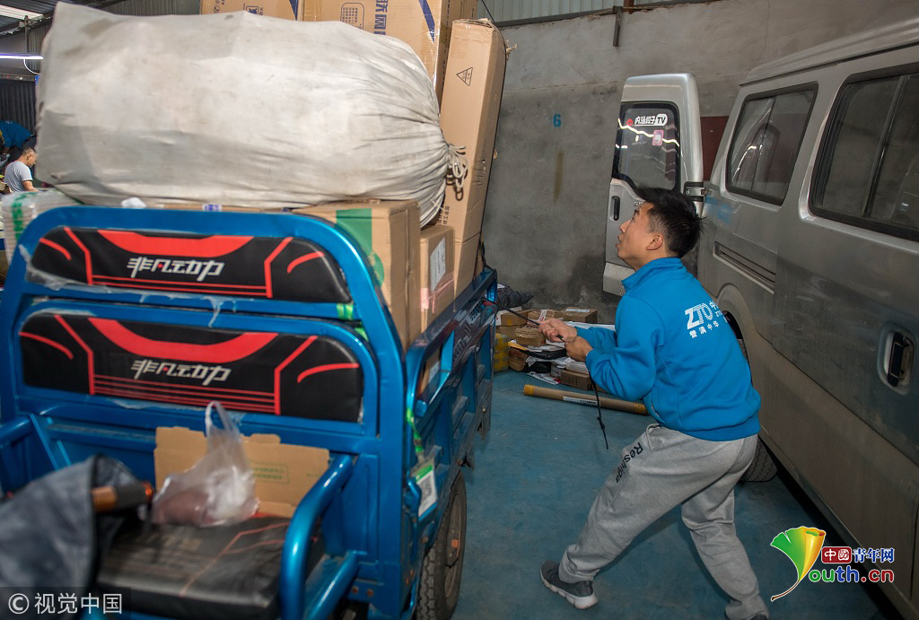 2018年10月16日,云南省昆明市,攝影師實拍90后快遞員熊忠桃的一天工作。作為一名快遞員,他25歲就買了房,9月份收入3萬多。圖片作者:銳圖