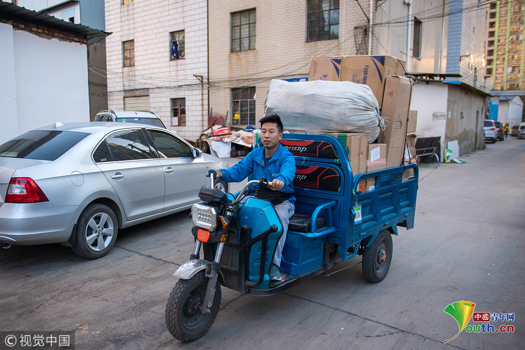 云南省昆明市,攝影師實拍90后快遞員熊忠桃的一天工作。作為一名快遞員,他25歲就買了房。圖片作者:銳圖