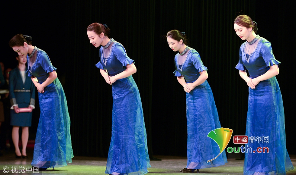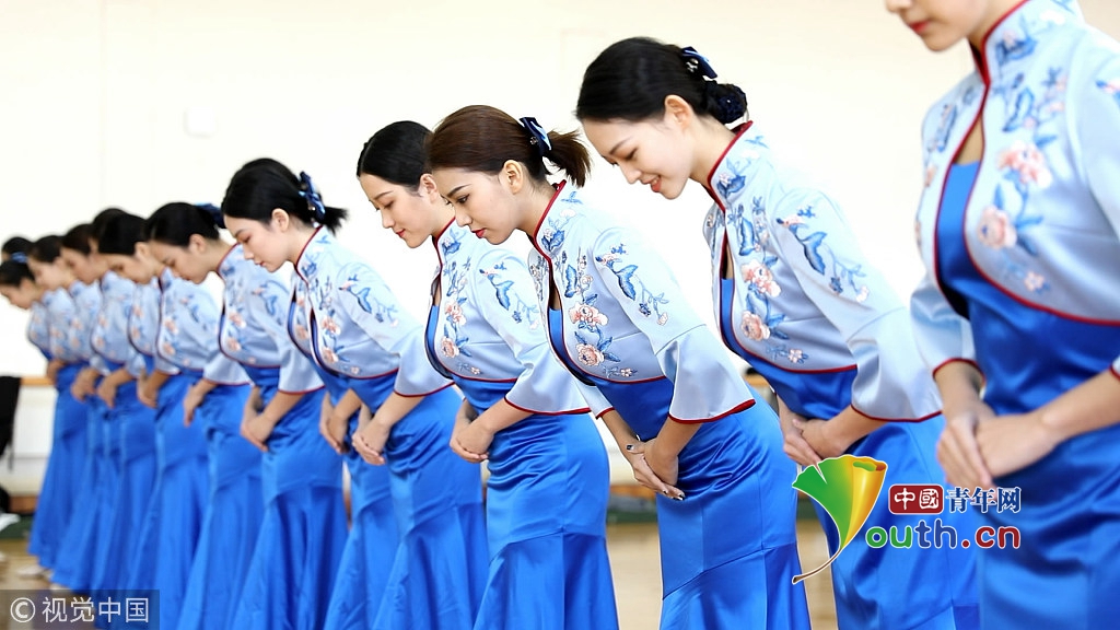 2018年10月15日,杭州,第五屆世界互聯(lián)網(wǎng)大會召開在即,來自浙江傳媒學(xué)院的禮儀志愿者們正在進(jìn)行緊張有序的集中訓(xùn)練。圖片作者:浙江日報 馮賀/視覺中國