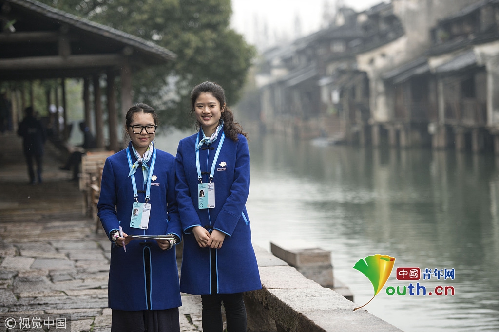 2015年12月13日,浙江嘉興,桐鄉(xiāng)烏鎮(zhèn)景區(qū),引導(dǎo)志愿者著裝上崗,她們將在景區(qū)各個站點開展引導(dǎo)咨詢服務(wù)。