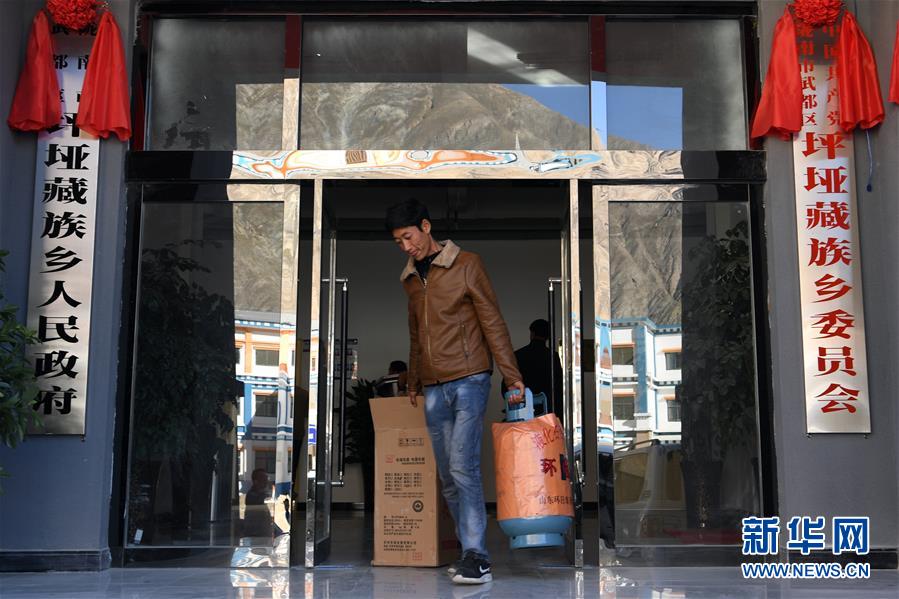 在隴南市武都區(qū)“新坪埡”,村民到鄉(xiāng)政府領取幫扶單位贈送的灶具(10月31日攝)。新華社記者 范培珅攝