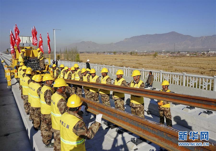 11月1日,中鐵三局的工人在京張高鐵河北懷來段鋪軌現(xiàn)場工作。