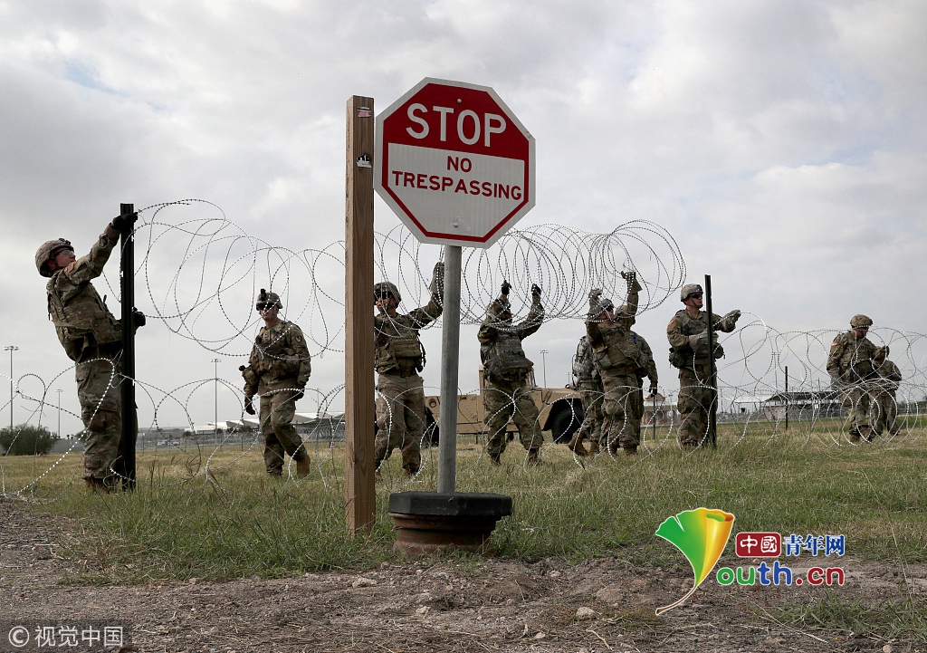 美國士兵在鋪設(shè)鐵絲網(wǎng)。