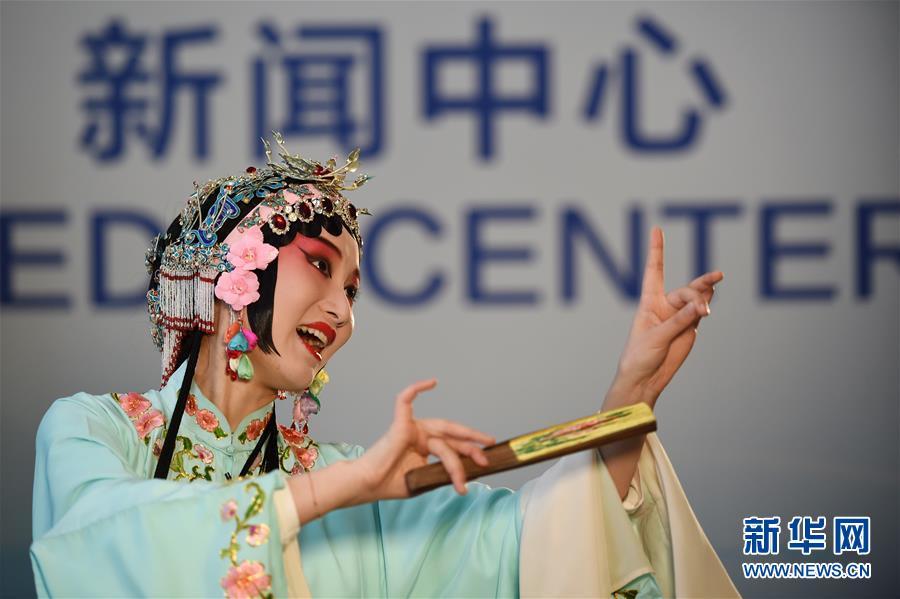 11月4日,在首屆中國(guó)國(guó)際進(jìn)口博覽會(huì)新聞中心,演員展示昆曲藝術(shù)。新華社記者 韓瑜慶 攝