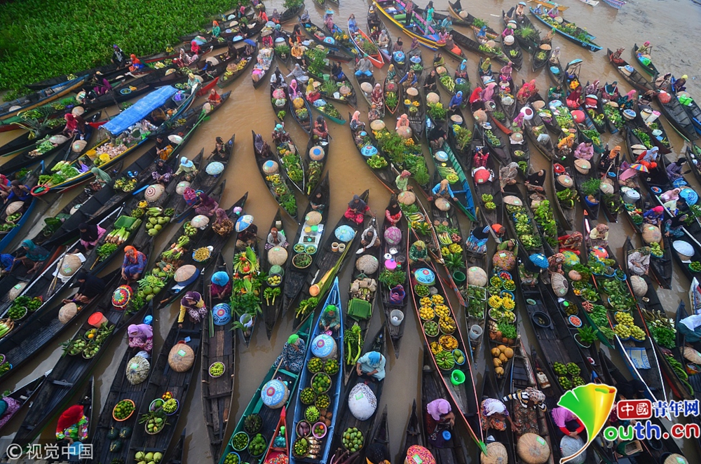富有煙火氣息的印尼水上集市 商販用獨(dú)木舟載貨