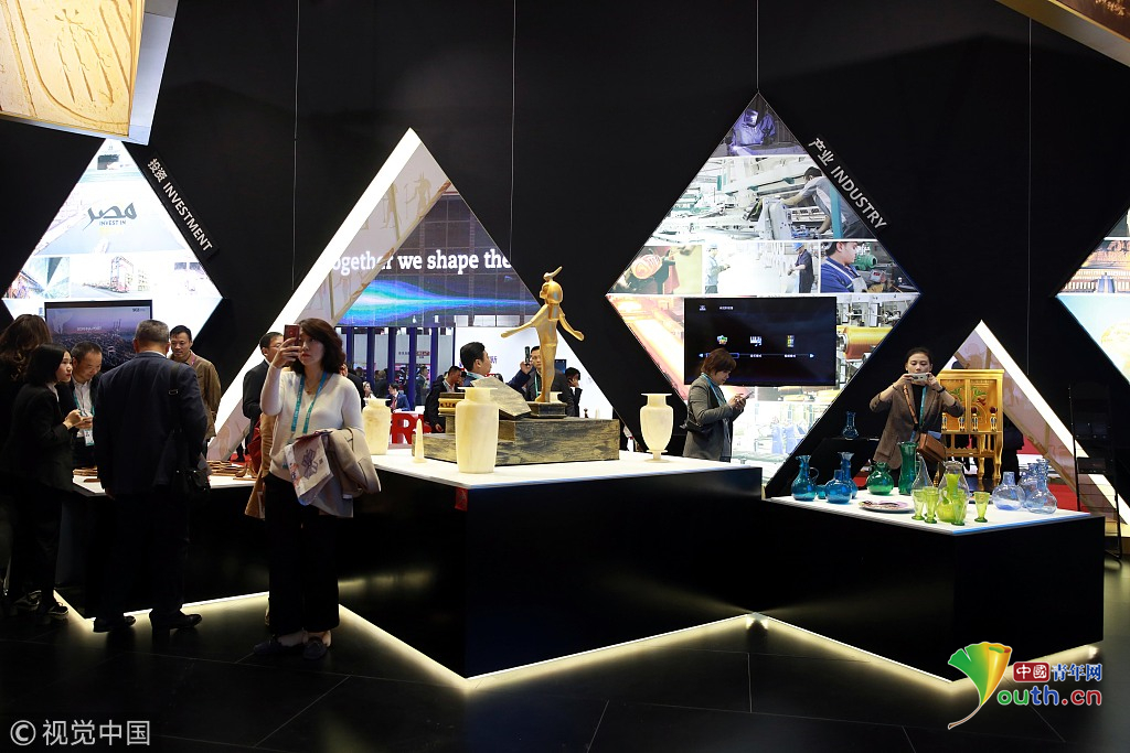 2018年11月6日,上海,首屆中國國際進口博覽會國家展上,共有82個國家、3個國際組織設(shè)立了71個展臺。埃及館。視覺中國