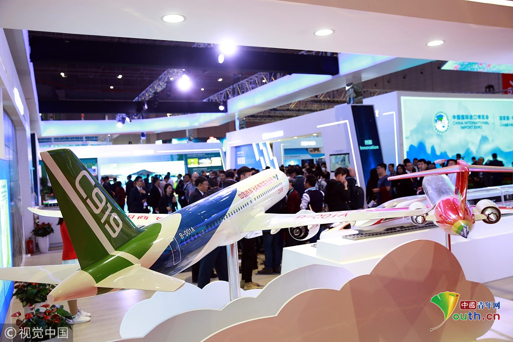 2018年11月6日,上海,首屆中國國際進口博覽會國家展上,共有82個國家、3個國際組織設(shè)立了71個展臺。中國館展示的C919飛機。視覺中國