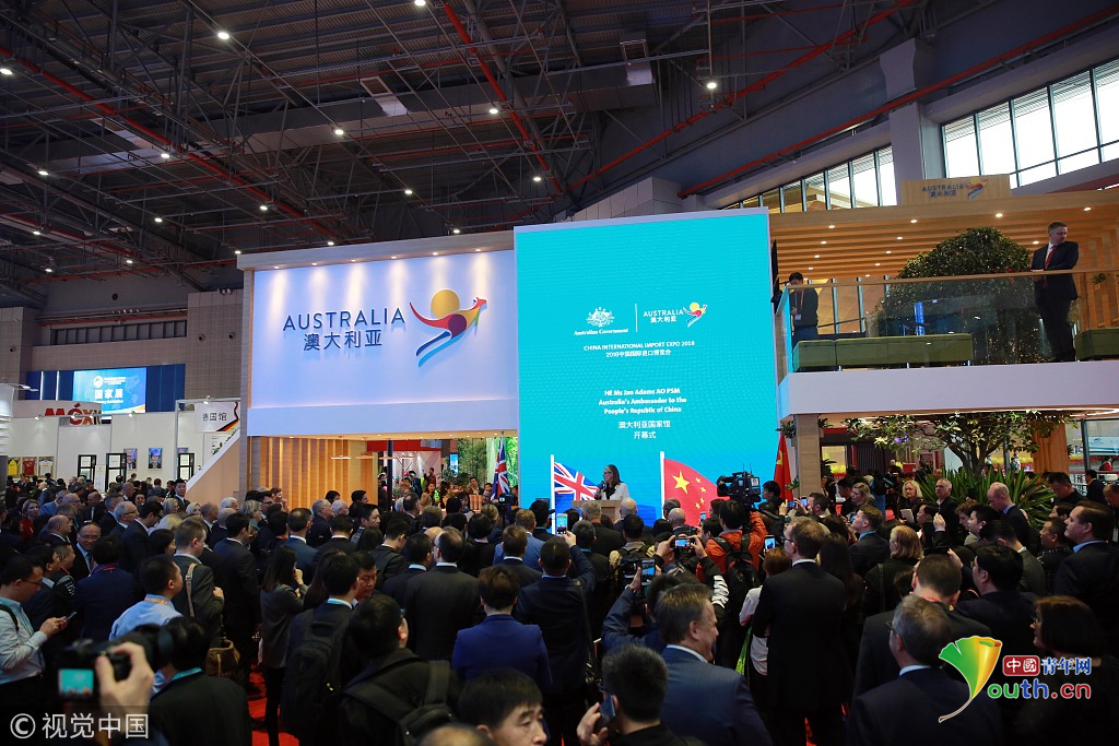 2018年11月6日,上海,首屆中國國際進口博覽會國家展上,共有82個國家、3個國際組織設(shè)立了71個展臺。澳大利亞館新產(chǎn)品、新技術(shù)發(fā)布。視覺中國