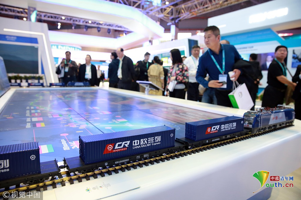 2018年11月6日,上海,首屆中國國際進口博覽會國家展上,共有82個國家、3個國際組織設(shè)立了71個展臺。中國館展示的中歐班列。視覺中國