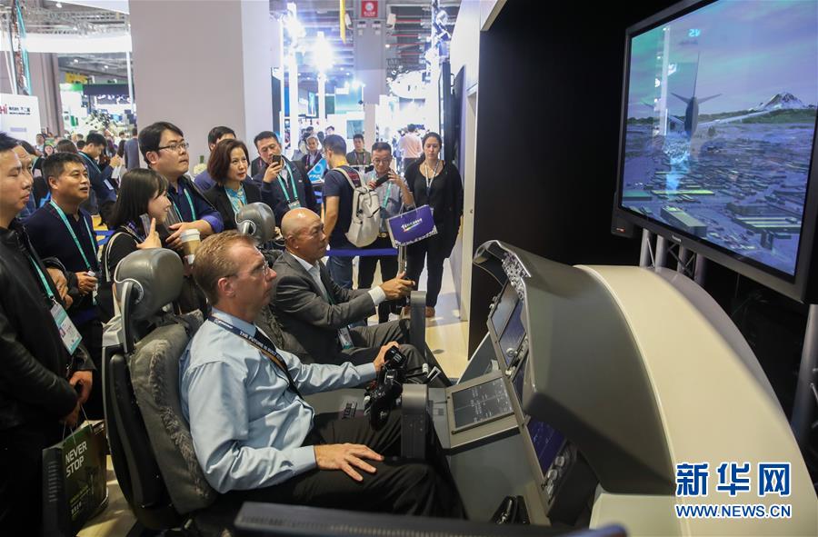 11月6日,參觀者在美國波音公司展臺體驗“駕駛”波音客機。新華社記者 丁汀 攝