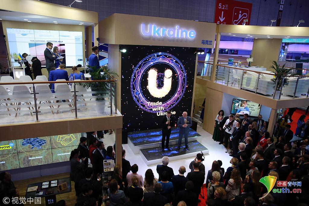 2018年11月6日,上海,首屆中國國際進口博覽會國家展上,共有82個國家、3個國際組織設(shè)立了71個展臺。烏克蘭館新產(chǎn)品、新技術(shù)發(fā)布。視覺中國