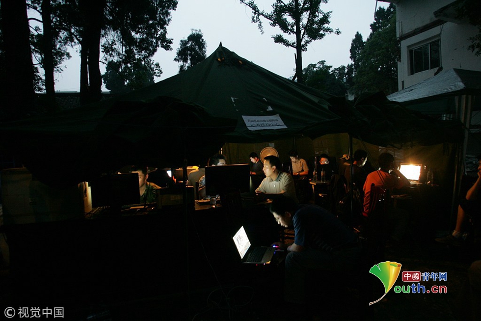 2008年5月17日晚。青川縣委宣傳部在機關(guān)大院倒塌的廢墟上,為從各地趕來的記者設立了帳篷發(fā)稿中心,此前由于通訊中斷與外界失去聯(lián)系,比起其它災區(qū)被媒體關(guān)注晚了三天,被譽為“最后發(fā)現(xiàn)的重災區(qū)”。圖片作者:李杰/視覺中國