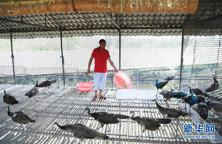 5月16日,在重慶市銅梁區(qū)永嘉鎮(zhèn)高龍村,閻仁兵在養(yǎng)殖場(chǎng)內(nèi)給藍(lán)孔雀喂食。 新華社記者 王全超 攝