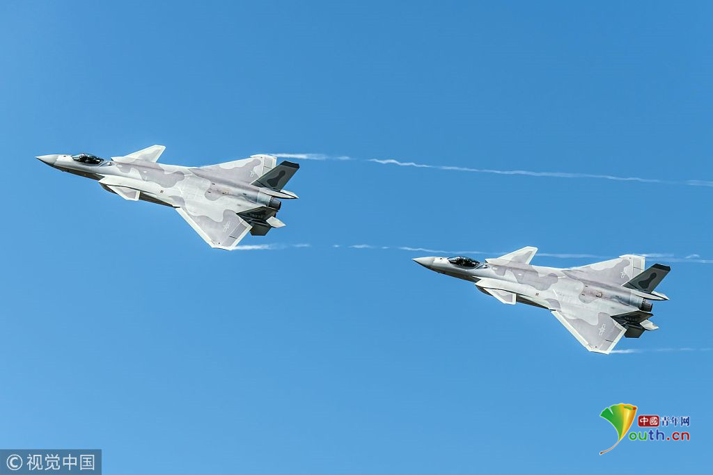 圖二:2018年11月6日,廣東珠海航展上,兩架殲-20戰(zhàn)機(jī)組成雙機(jī)編隊進(jìn)行飛行表演。